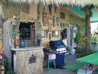Tiki backyard: On the far left, a fully stocked bar for